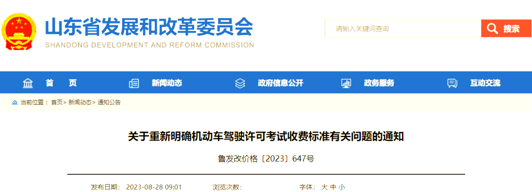 今日,山东省发展和改革委员会官方网站公布了《关于重新明确机动车驾驶许可考试收费标准有关问题的通知》。