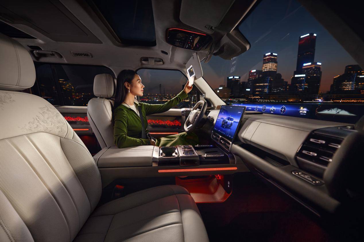 G700座舱的“灵感四屏联动”系统极具冲击力:35.4英寸山脉天际屏(14:1宽高比、3K分辨率、1000nits亮度)横跨中控台,15.6英寸中控触控大屏(3A游戏级画质、60Hz刷新率)居中,17.3英寸后排家庭影院大屏(支持1080P播放)与8.88英寸后排空调屏(触控灵敏)互补,四屏信息同步、功能联动,告别传统越野车“机械按键堆砌”。