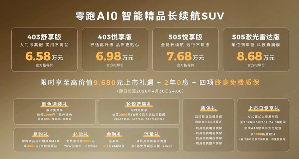 重点来了,捡漏时刻别错过!3月26日刚上市的零跑A10,共4款车型,指导价6.58-8.68万元,限时享至高9680元权益、2年0息,首任车主享四项终身免费质保,6.58万起就能拿下长续航纯电SUV,性价比直接拉满。各位老铁,您怎么看呢?欢迎回复评论!