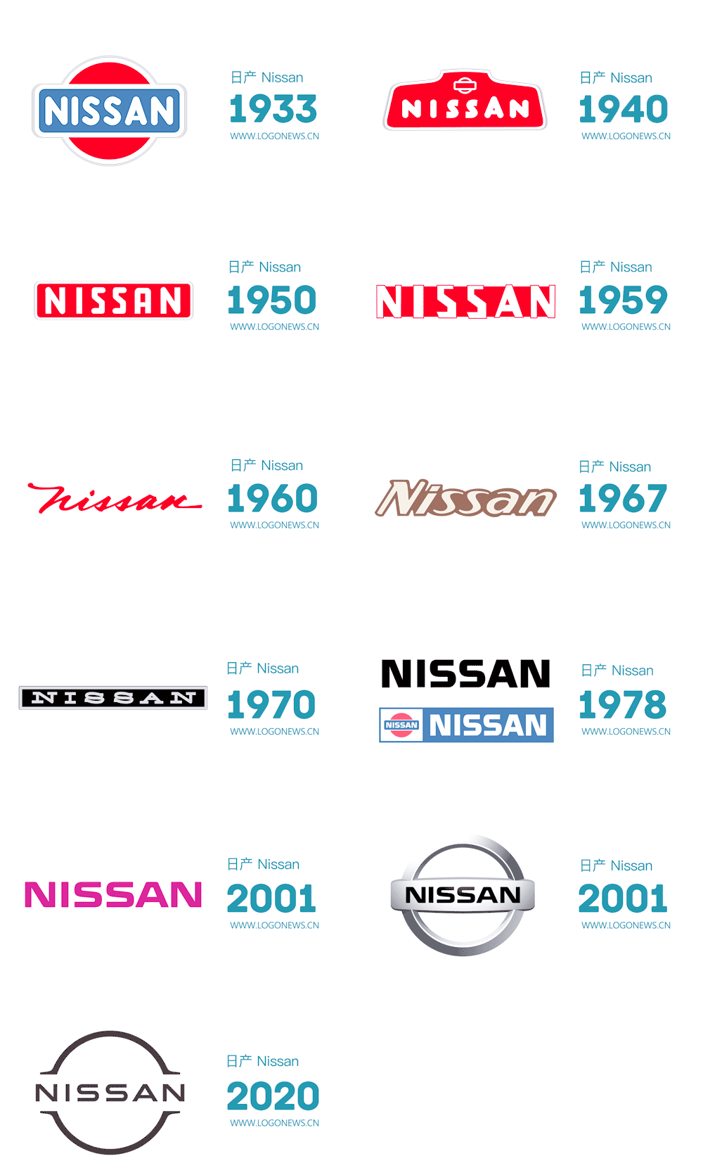 在1978年之前,日产汽车的LOGO经历了多次变革,尤其是「NISSAN」文字的设计,推出了众多不同的版本。然而,自2001年起,字体与图形设计实现了进一步的统一,并沿用至今。