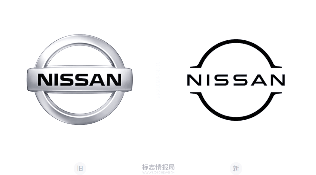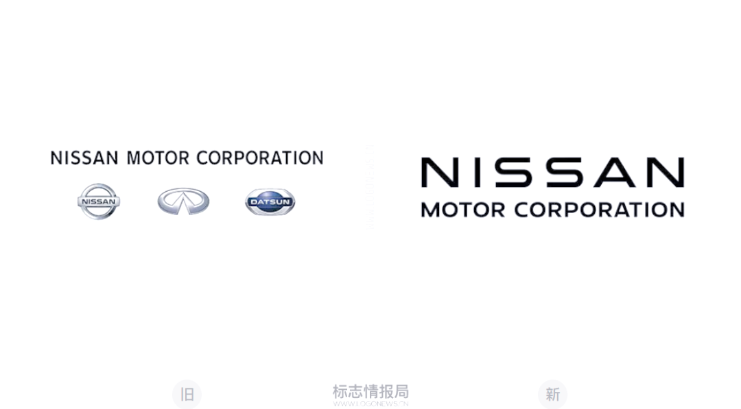 日产汽车公司企业LOGO的新旧对比显示,新版LOGO直接采用了日产新LOGO中的无衬线文字组合,包括「NISSAN」和「MOTOR CORPORATION」,同时去除了原有的品牌符号。