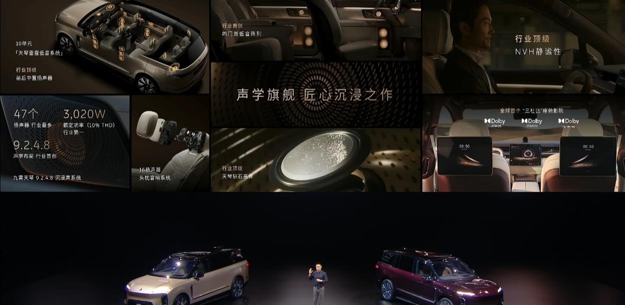 音响系统更是堆料堆到了极致。九霄天琴9.2.4.8沉浸声系统,全车47个扬声器,总功率3020瓦。高音单元用的是100%纯钻石打造的天琴钻石高音单元。蔚来给这套系统申请了全球首个“三杜比”认证——杜比全景声、杜比视界、杜比动态视频增强。李斌说,这不是在车里听音乐,这是在移动音乐厅里享受演出。