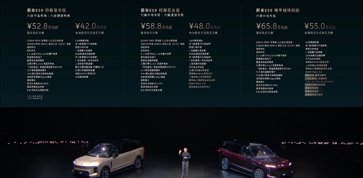 三款车的价格摆在屏幕上:行政豪华版52.8万元起,行政签名版58.8万元起,地平线特别版65.8万元起。如果选择BaaS电池租用方案,价格直接降到42万元起、48万元起和55万元起。这个价格区间,正好卡在了50万到70万这个传统豪华品牌燃油SUV的腹地。李斌说,ES9是“蔚来十一年体系创新的集大成之作”,要“引领行政旗舰SUV进入纯电时代”。这话说得很大,但看看这车的尺寸,你不得不承认他确实有说这话的底气。