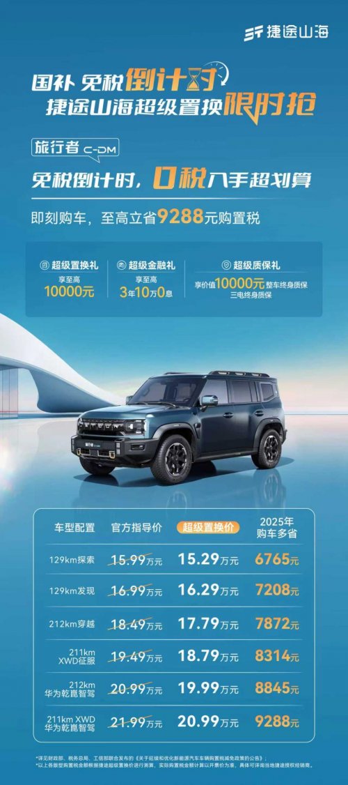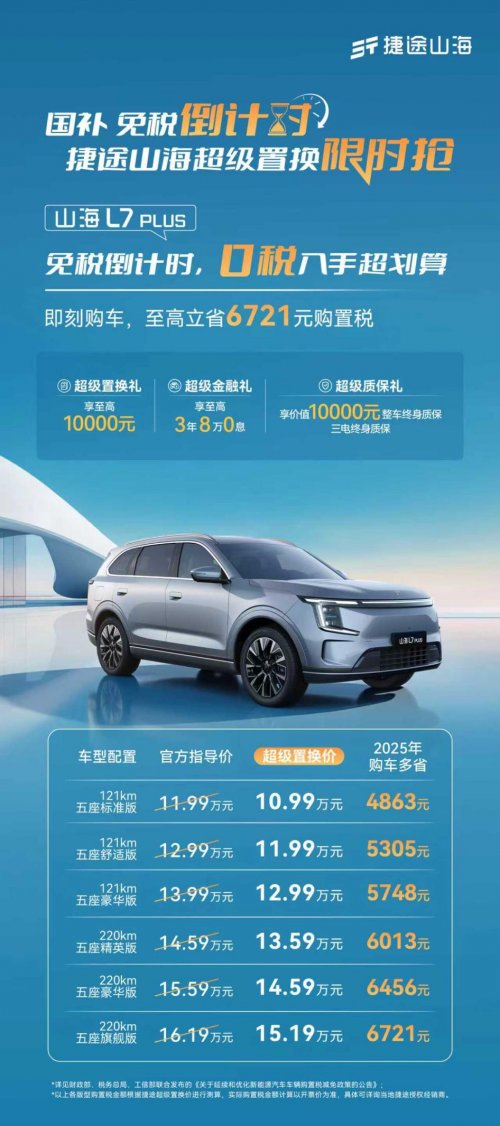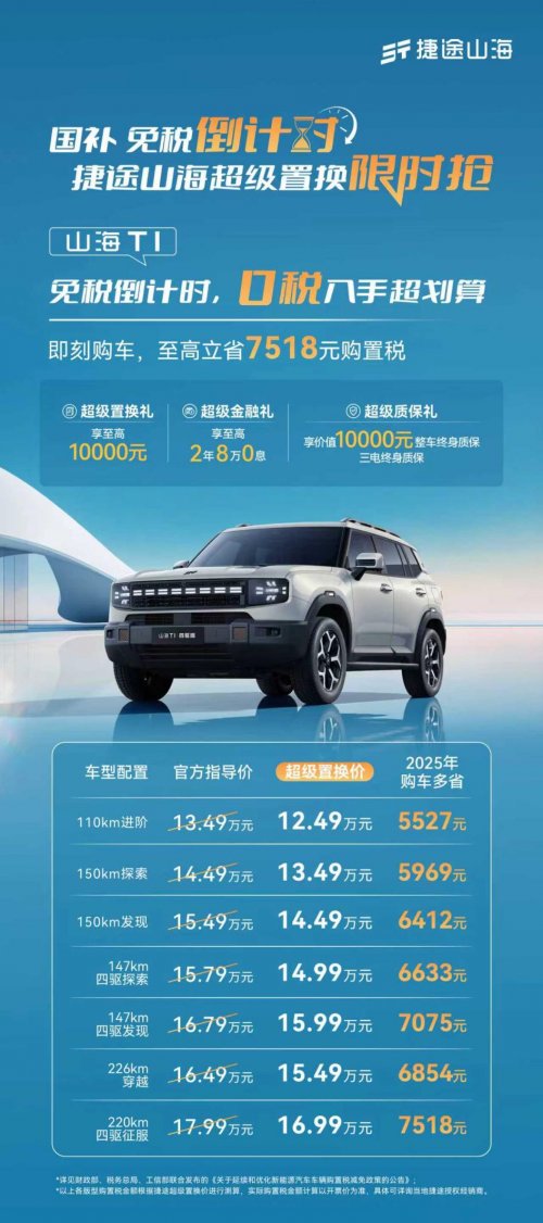 国补免税倒计时!捷途山海L7 PLUS 10.99万起,限时置换 任赝钒说科技 发布时间:2025-12-04 16:36 国补免税倒计时!捷途山海超级置换限时抢,捷途旅行者 C-DM 15.29 万起、捷途山海 L7PLUS 10.99 万起、捷途山海 T1 12.49 万起,0 税入手超划算~ 0 全部评论 (0) 暂无评论 热门推荐 01:32 2017款广汽丰田致炫轮毂 行车视线露露Ai分身 延边车主必看24小时拖车服务实用指南 山东有啰信息科技有限公司 豪爵全新 DL250(26 款)曝光:外观升级实锤,但核心配置依旧原地踏步?解析来了! 机车小三万 01:21 思域 odb设置 胖子车神暖暖_AI分身 01:33 小车轮胎气压标准是多少psi 胖子车神暖暖_AI分身 2025款奔达黑旗950深度剖析:43800元国产V4巡航,动力猛配置全还破垄断 现在讲车大大 别猜了,我给你答案!五羊本田150复古踏板即将来袭! 骑士分享 00:07 千万不要买思域,10年了一点毛病没有,提高不了一点修车技能 老齐爱开车 00:55 十年轿车报废多少钱 峡谷战术官 00:55 全新丰田GR GT亮相:4.0T V8发动机演绎性能传奇 21号键盘车手 加载中...