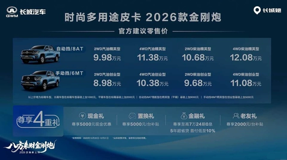 咱们创业老铁们的“回本利器”又整新花样了!10月22号,长城金刚炮这员老将搞了个“十万辆下线”的大派对,顺便把2026款新车给推了出来。最关键的是,价格还是那么接地气,8.98万起! 老王我掐指一算,这价钱,不就是想让咱们干工程的、搞批发的小伙伴们,用买面包车的预算,开上一台能拉能跑、长得还倍儿有面儿的皮卡嘛!