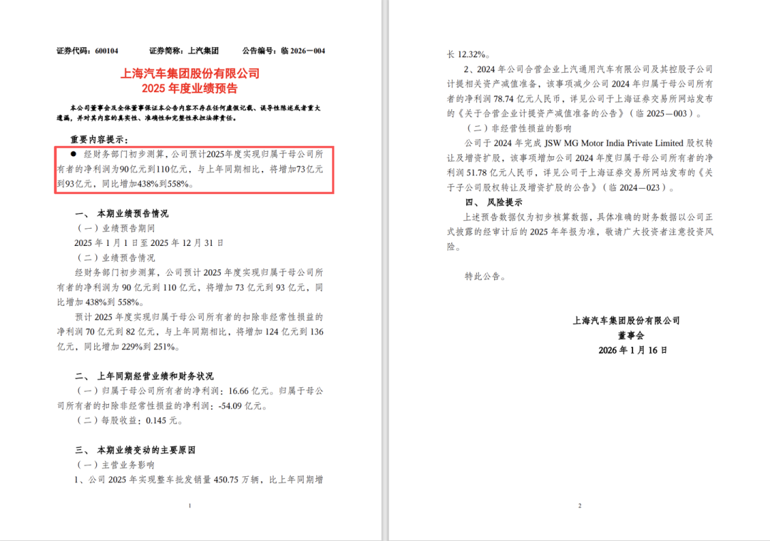 2025年,上汽预计净利润90到110亿元,同比最高暴增550%。在这个内卷的时代,上汽不但没有亏损,还狂赚了一笔。这个数据,可以说非常惊艳,甚至超乎所有人的想象了。它的这些钱是从哪里赚来的呢?为什么上汽净利润突然就暴增了呢?