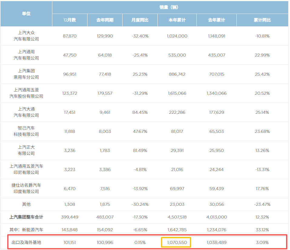 可即便如此,上汽还是顶住压力,对欧出口量历史性地突破了30万辆,稳居中国在欧第一车企。海外总销量呢?也突破了107万辆,创造上汽出口新记录,位列中国第二,仅次于奇瑞。