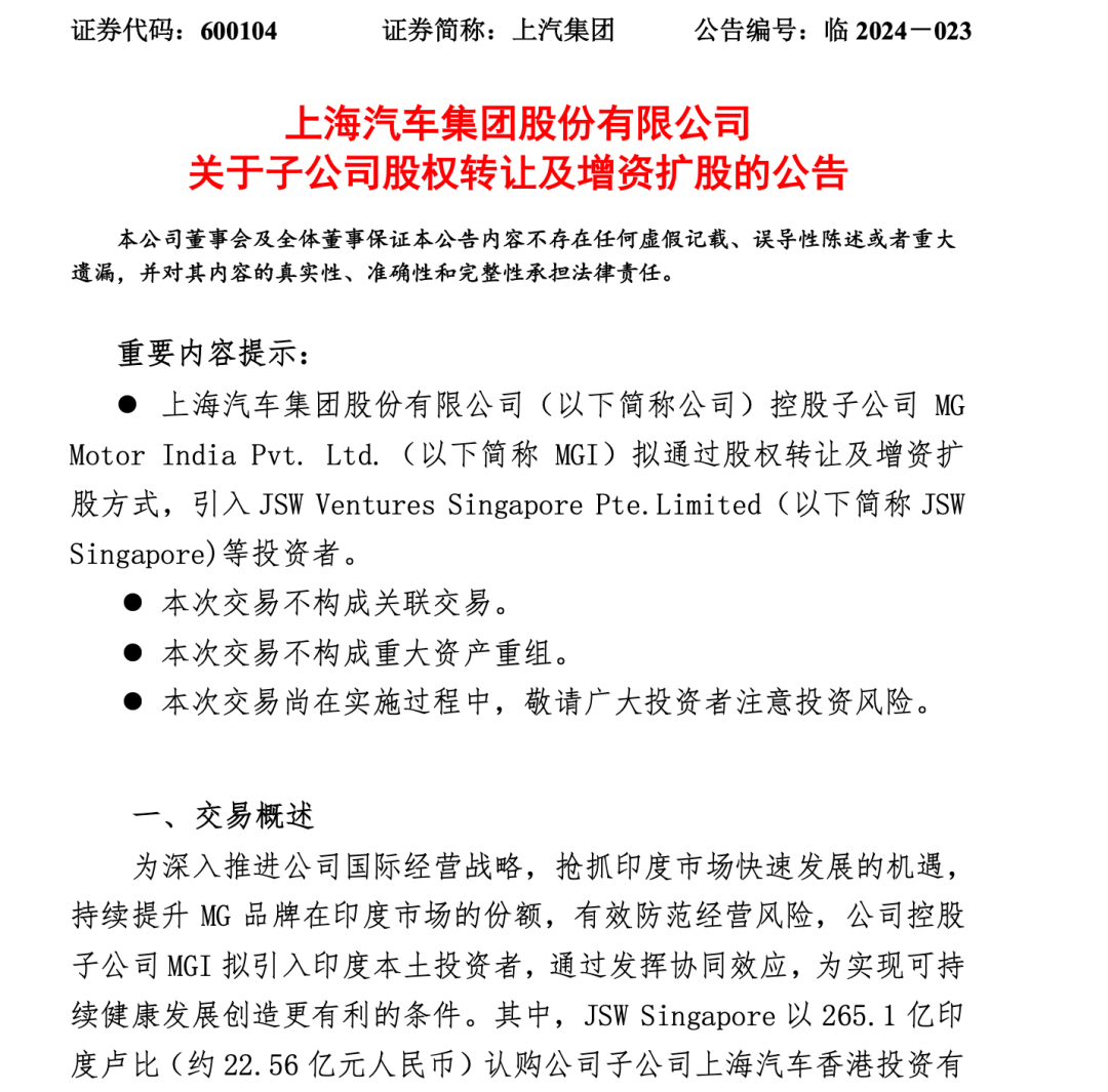 其三呢,就是股权收入了。上汽印度子公司,出售了51%的股权,预计获利50亿到70亿元!其中,印度JSW集团持股35%,印度经销商集团占股3%,员工持股5%,还有一家印度金融机构,持股8%。其中,印度JSW集团,已经对上汽完成付款。