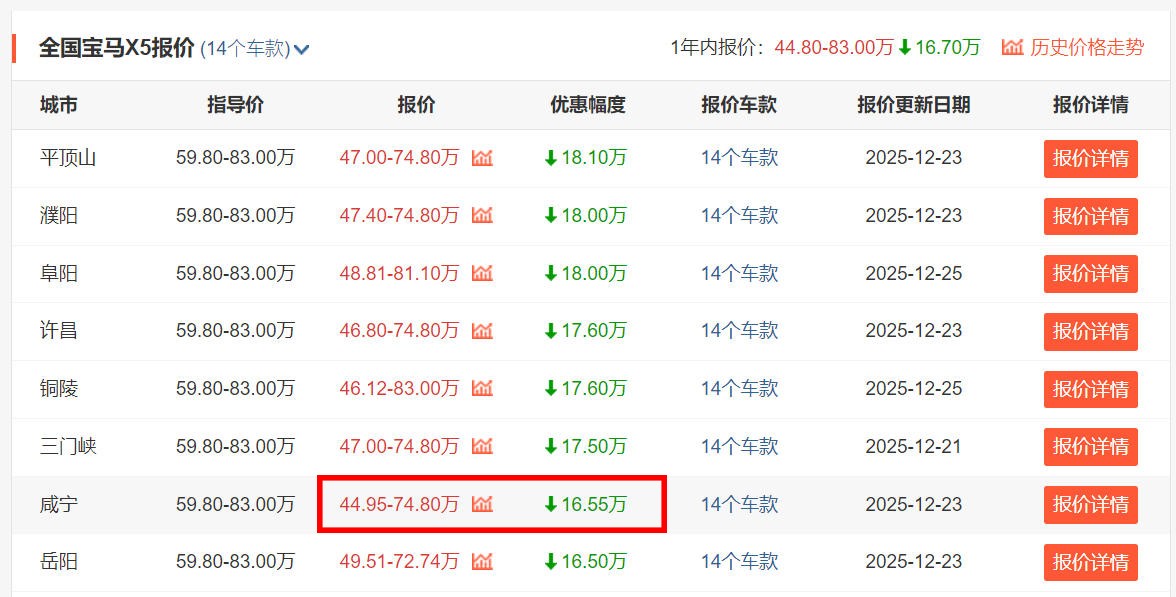 宝马X5自从国产了之后,其售价便下调了不少。而现如今,随着全新一代宝马X5马上问世,现款X5终端也已经 出现了很大的优惠幅度。据我们了解,目前宝马X5在全国的最低价格已经来到了44.95万起步,相当于终端直接降了16.55万元,那这性价比还是很高的。