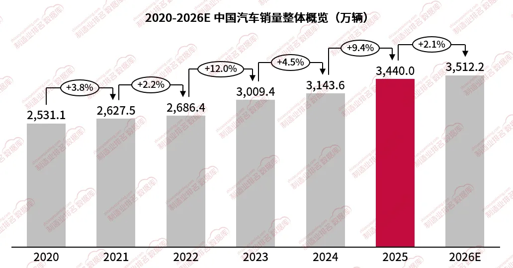 2025年中国汽车总销量完成3440万辆,同比增长9.4%,乘用车销量超3000万辆,商用车销量规模重回400万辆以上。
