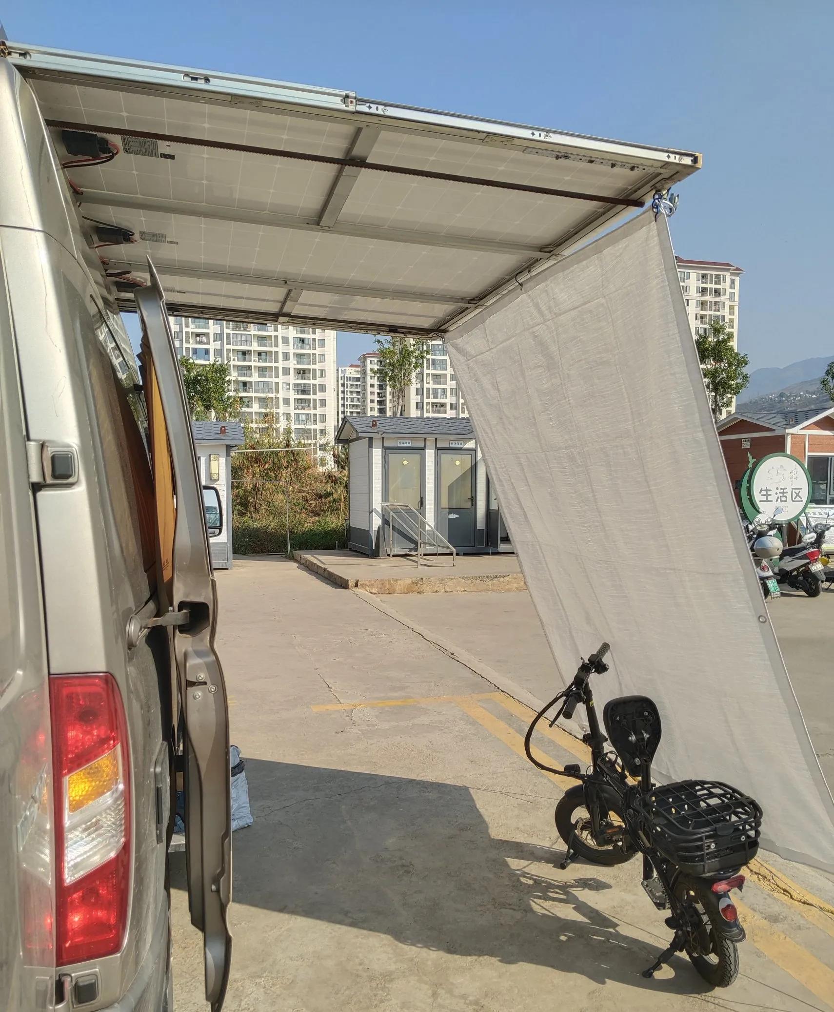 再看看我这套东西。1200W的拓展+半追光太阳能板,总造价4000块。而且这套板子平时还能当遮阳棚用,抗风性能比市面上那些房车专用遮阳棚还强。原本买个遮阳棚怎么也得2000块吧?这一下就省出来了,相当于这套太阳能板我只花了2000块。最关键的是,我车上装的48V 160Ah锂电池,16度电的容量,在云南这边每天下午两点就能充满。