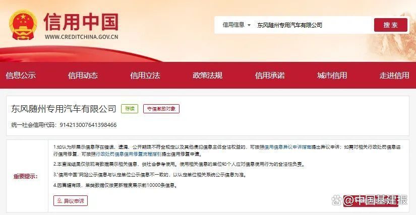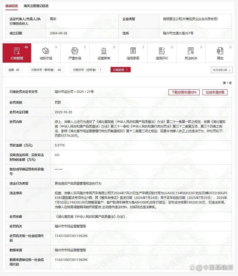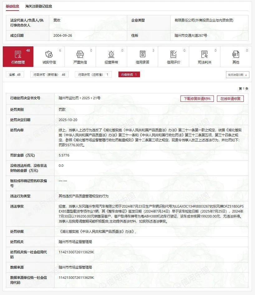 (信息来源:信用中国、东风随州专用汽车有限公司官网)