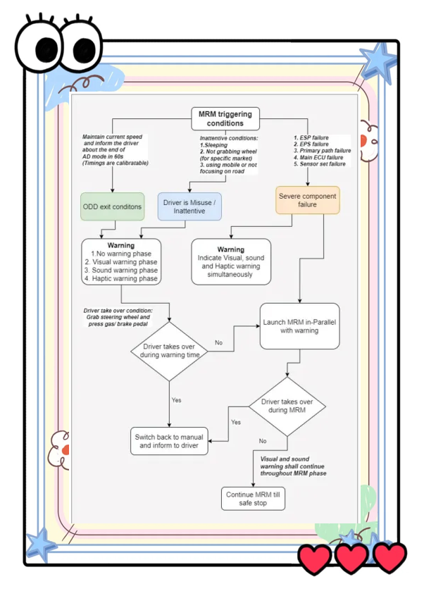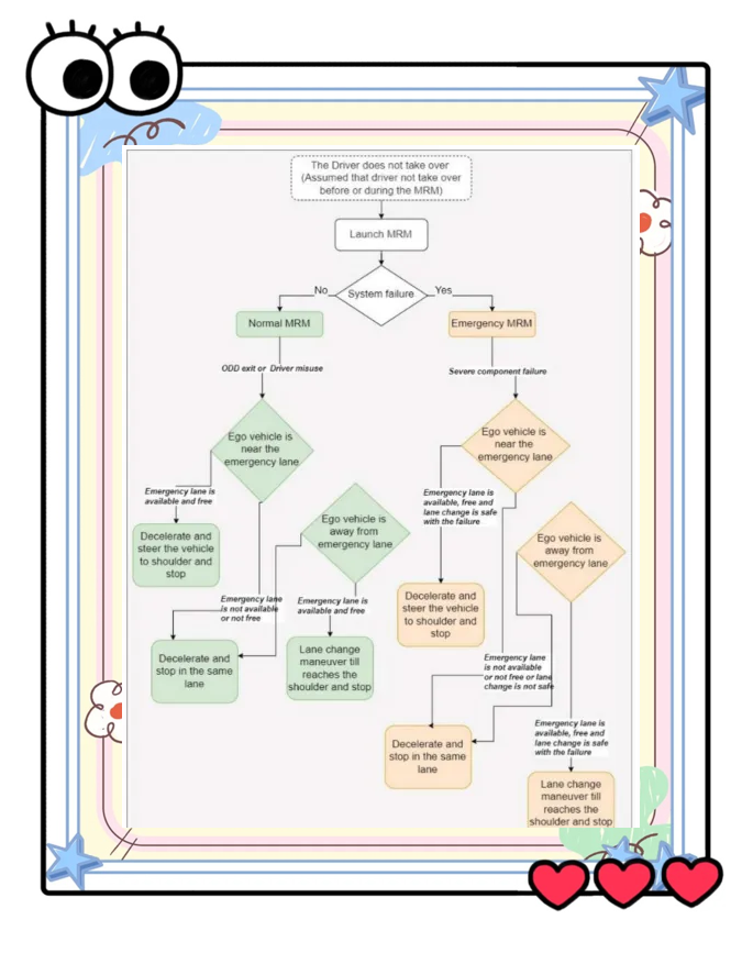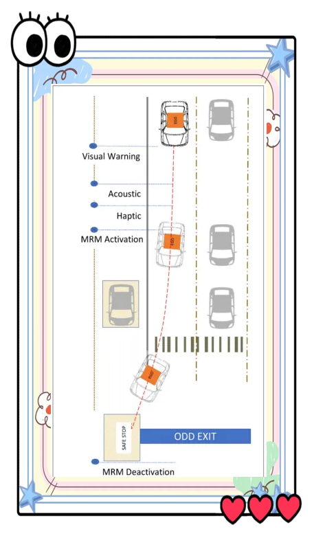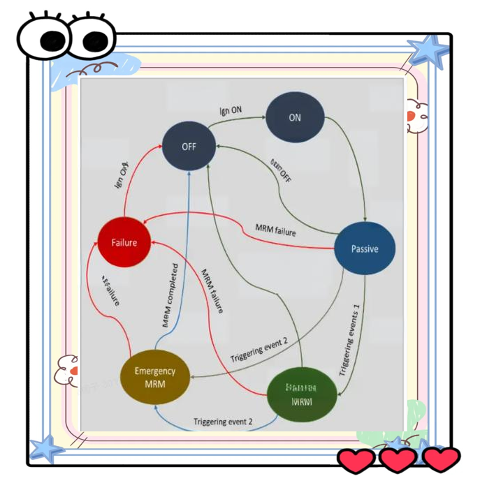 MRM的触发条件通常包括AD模式结束、ODD退出或驾驶员未能响应接管请求等严重故障情况。此外,根据不同制造商的设计要求,还可能存在其他触发MRM的因素。