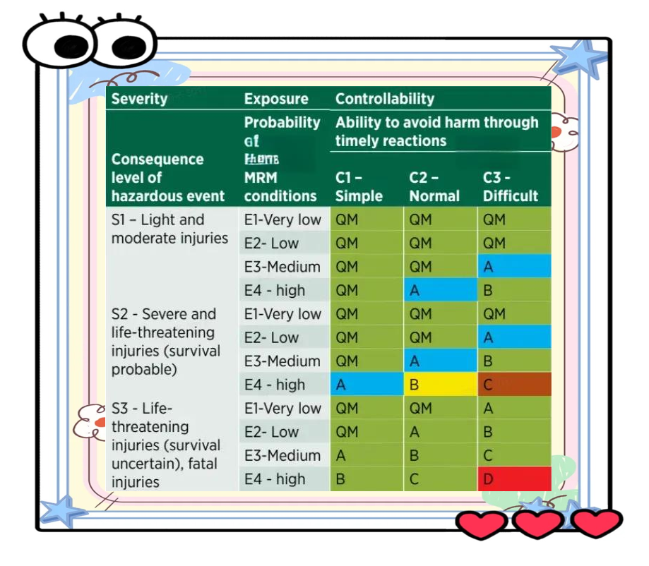 第二步是根据危险事件的后果来定义严重度(S1-S3)。在大多数情况下,由于MRM功能完全自动化,且在操作过程中不期望驾驶员干预,因此难以合理评估其可控度(C1-C3)。