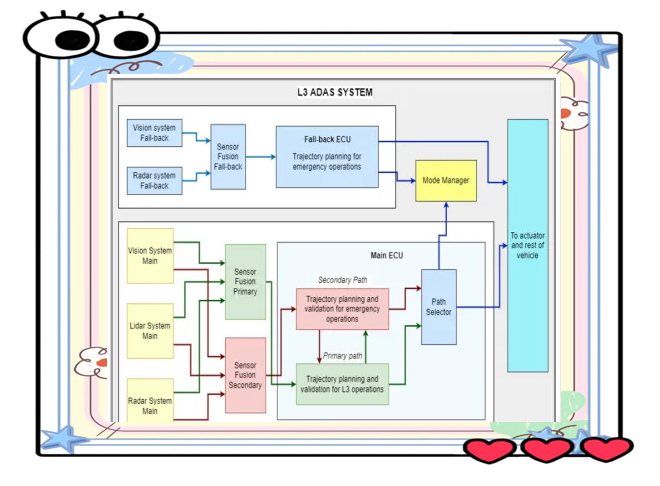 在L3自动驾驶系统中,冗余概念至关重要。通过采用独立/冗余的系统设计,L3系统能在自动驾驶过程中持续监控自身状态和外部环境变化。一旦检测到任何潜在风险或故障,系统将立即启动相应的安全措施,确保车辆始终处于可控状态。这种冗余设计不仅提高了系统的可靠性,也为驾驶员提供了额外的安全保障。