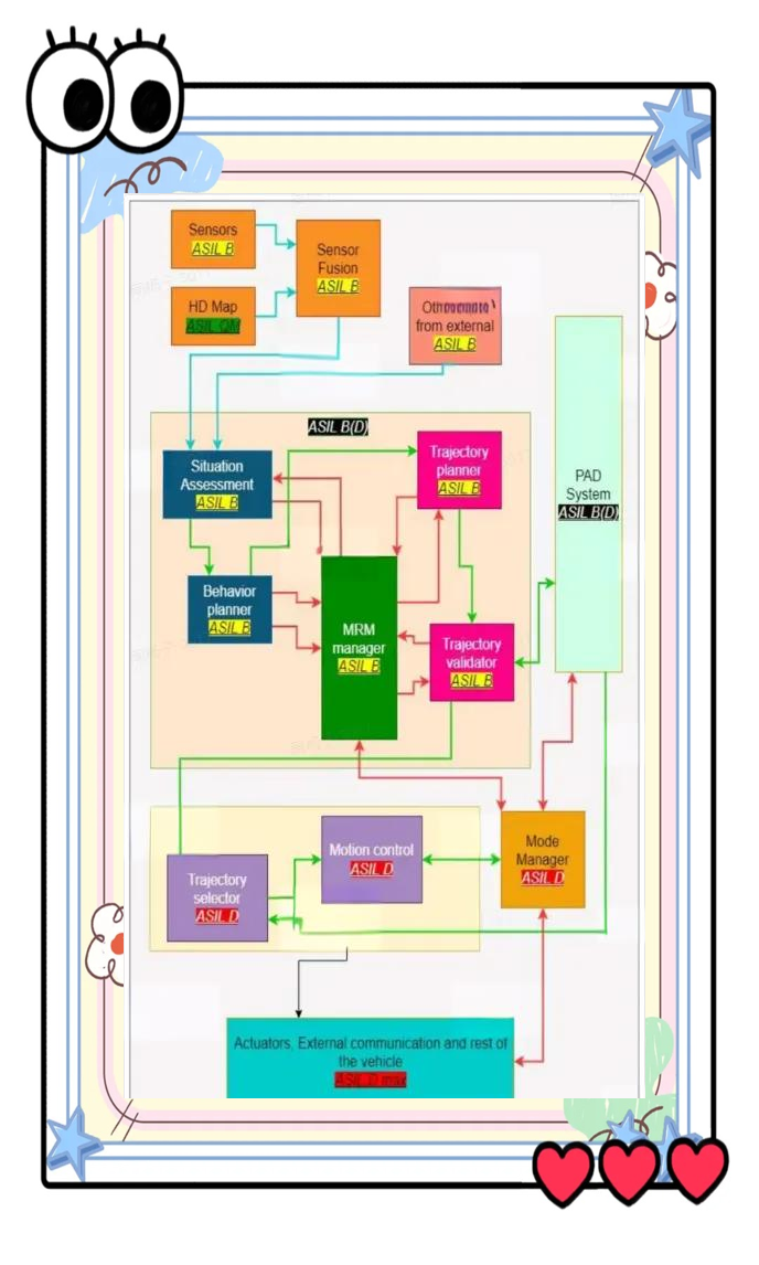 图7展示了MRM状态简化的示意图。在定义MRM的安全架构时,我们必须依据初步级别的性能要求来进行。首先,确定安全目标后,需要深入分析架构,并明确与安全相关的各个部件及其相应的ASIL等级。这种高层级的安全架构是定义具有合适ASIL等级的安全需求的必要基础,它不仅保障了系统级别的独立性,还为软件和硬件组件的开发提供了关键输入。