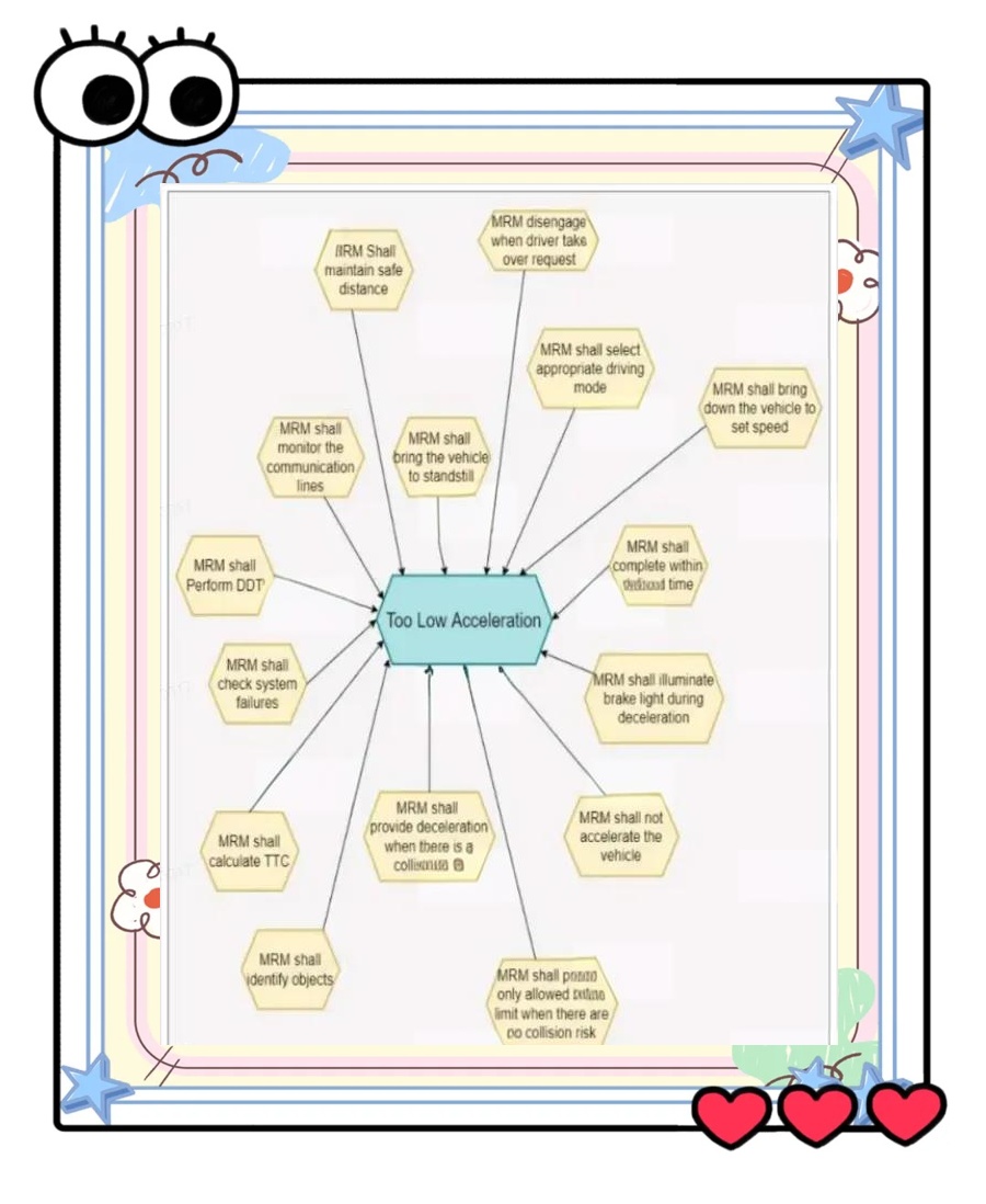 在完成风险评估后,我们确定了MRM功能的最大ASIL等级为“ASIL B”。接下来,我们需要根据每个危害事件、ASIL等级和容错时间间隔来定义MRM功能的安全目标。这些安全目标将作为MRM功能开发的顶层要求,指导我们确保其安全性和可靠性。根据HARA过程的输出,我们确定了11个关键的安全目标,其中包括: