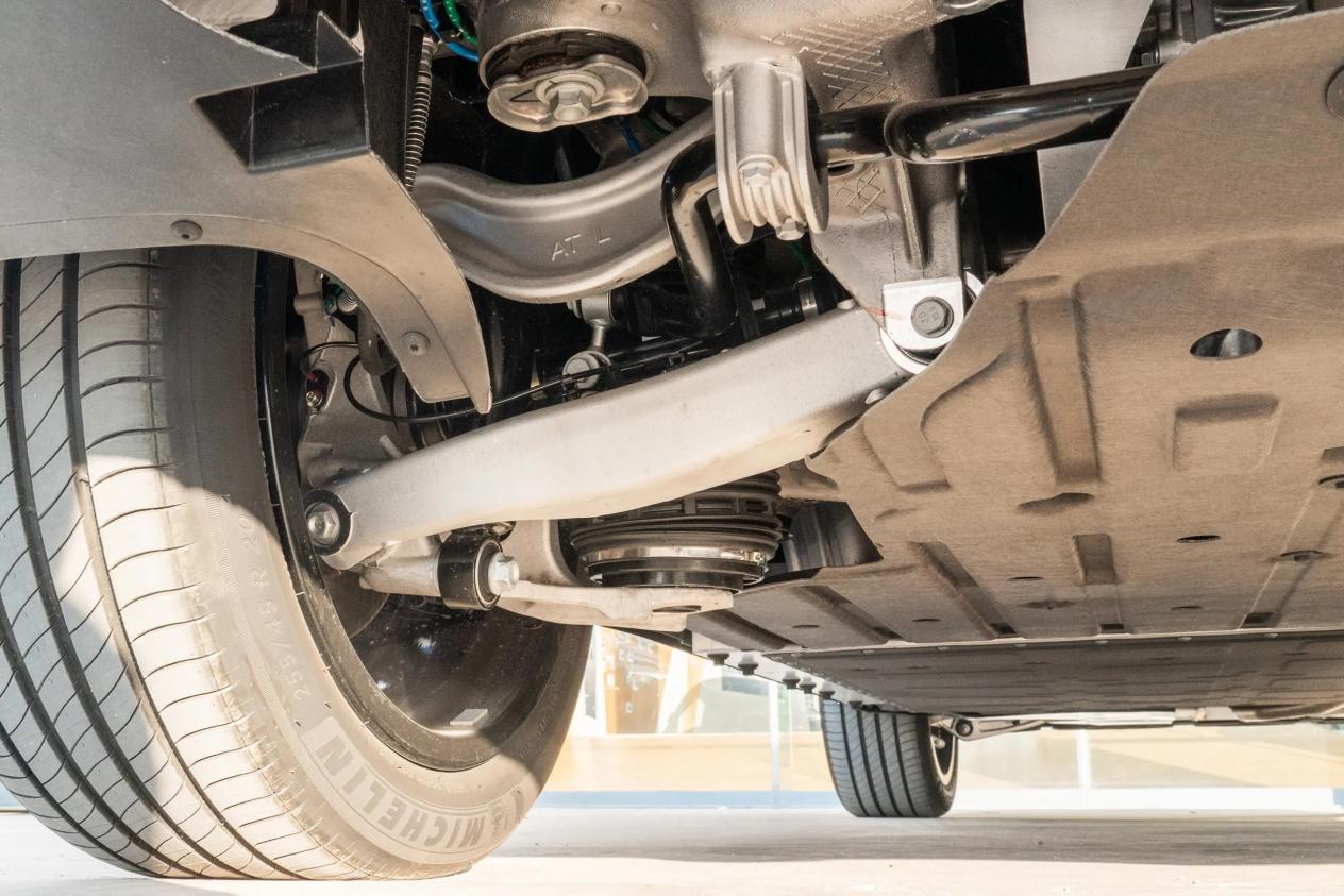 底盘采用前双叉臂+后H臂多连杆独立悬架结构,悬挂摆臂、羊角以及副车架等大量使用铝合金材质,降低簧下质量,提升操控响应速度。四驱版车型搭载保时捷同款的倍适登EDC减震器,配合可变魔毯底盘系统(空气弹簧+EDC),可主动扫描路面情况,实现每秒100次的阻尼实时调节,提前调整悬架参数,提升驾乘的舒适性和操控的稳定性。