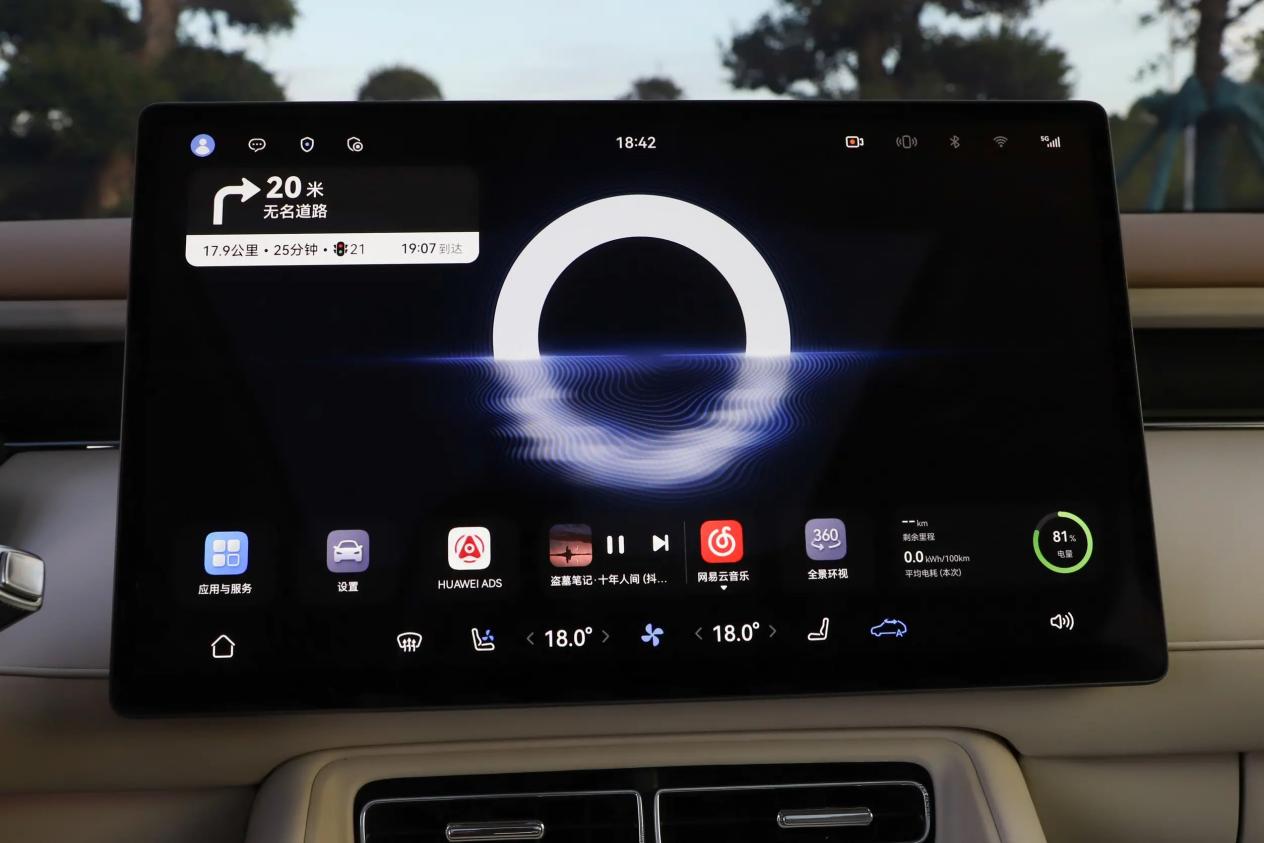 车内配备10.25英寸液晶仪表、15.6英寸2K分辨率悬浮式中控屏以及29英寸AR-HUD抬头显示,搭载鸿蒙座舱HarmonySpace 5,支持多屏联动。车机系统操作流畅度表现出色。系统UI界面采用卡片式设计,重要功能一目了然,学习成本低。