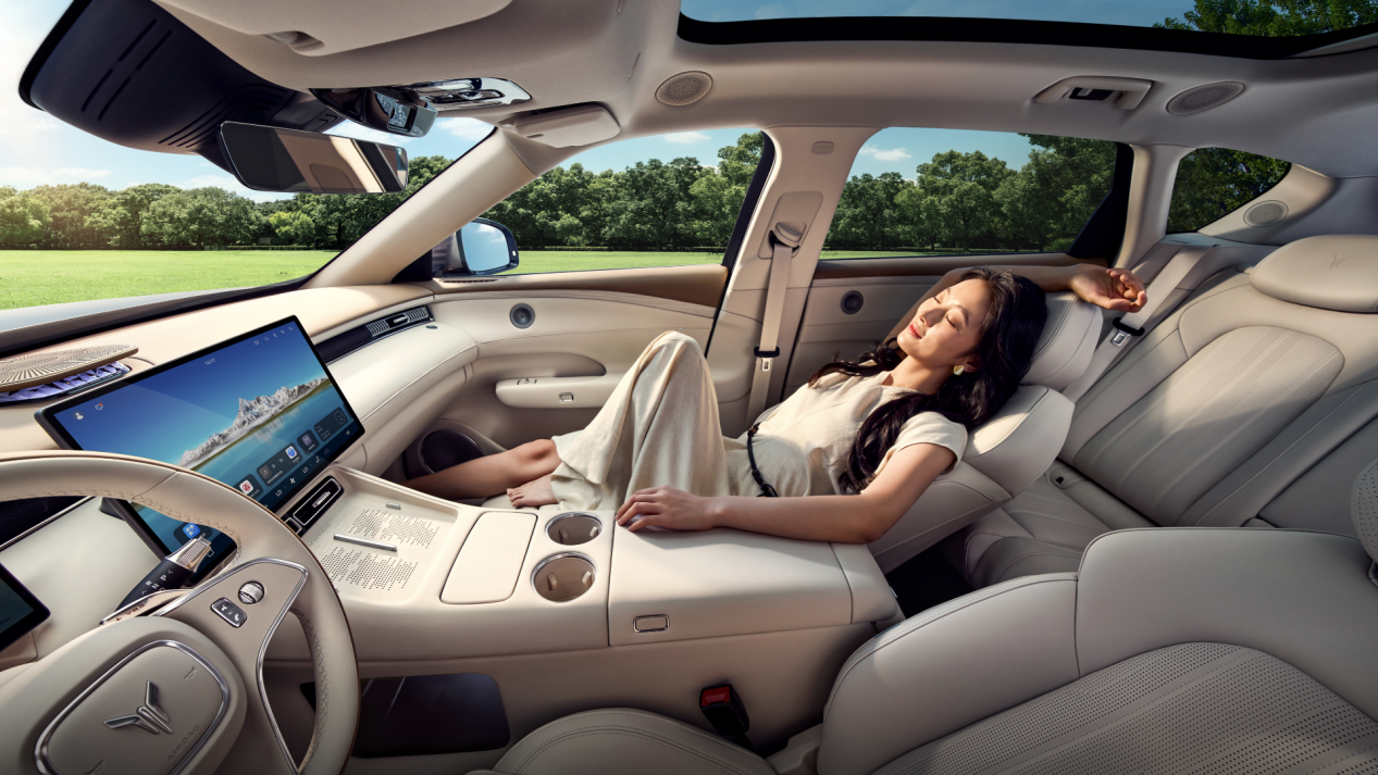 车内配的是云朵座椅,采用Nappa真皮包裹,内部填充物经过优化,支撑性和包裹性都挺好,做上去Q弹舒适。主驾驶座椅支持12向电动调节,并配备加热、通风和按摩功能。副驾驶座椅为"女王座椅",支持16向电动调节和一键躺倒功能,可调至163度近全平躺姿,同时配备电动腿托和8点式气动按摩系统。
