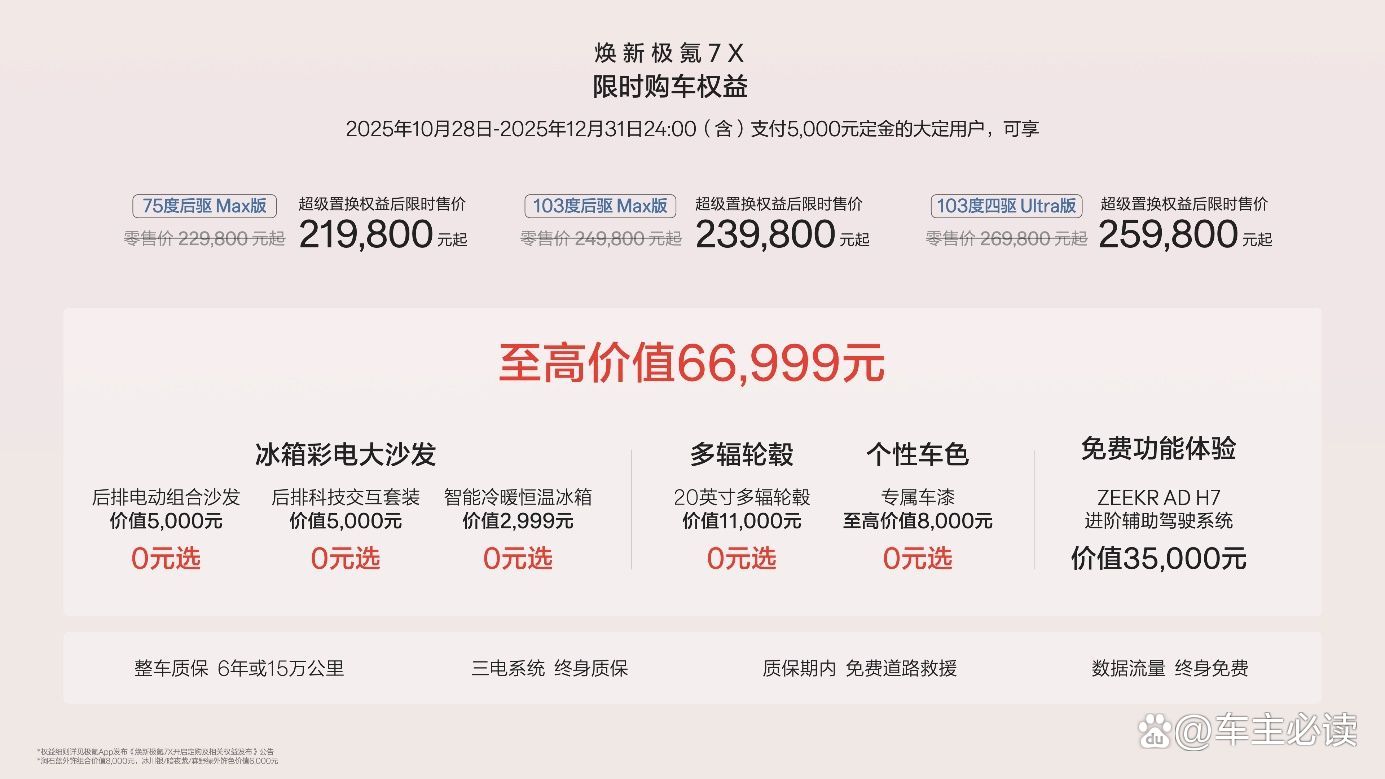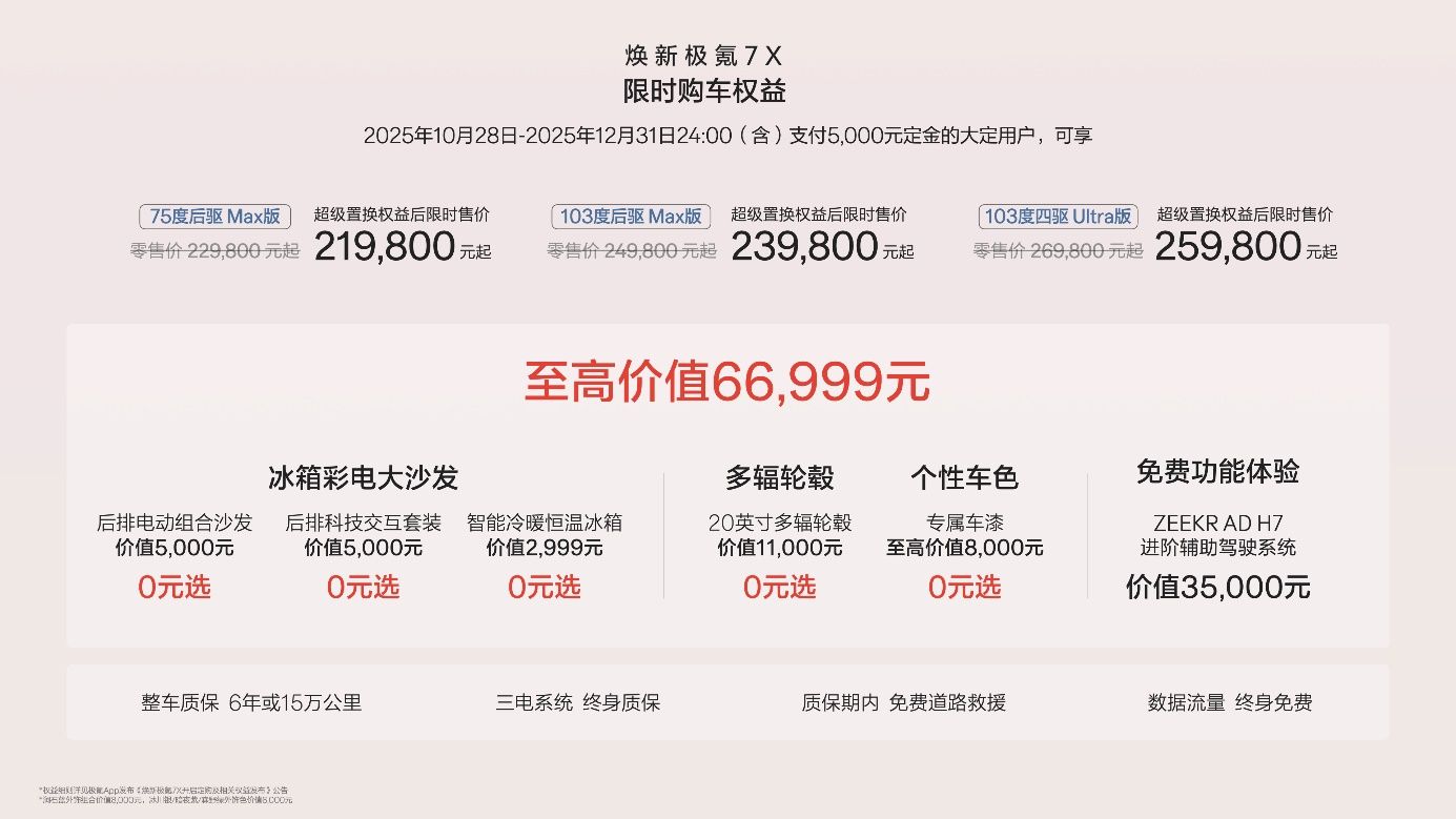 值得注意的是,购车权益的吸引力同样显著。2025年10月28日至12月31日期间,支付5000元定金的用户可获赠价值1.3万元的冰箱、电视和沙发组合,全系免费升级20英寸265mm宽胎及专属车漆,并可体验价值3.5万元的ZEEKR AD H7辅助驾驶系统终身功能。对于首任极氪车主增换购该车型,品牌还提供每年1000度的5年免费充电权益。此外,若因交付延迟导致无法享受购置税优惠政策,极氪承诺最高1.35万元的尾款抵扣。这些政策既降低了购车成本,也增强了用户信心。