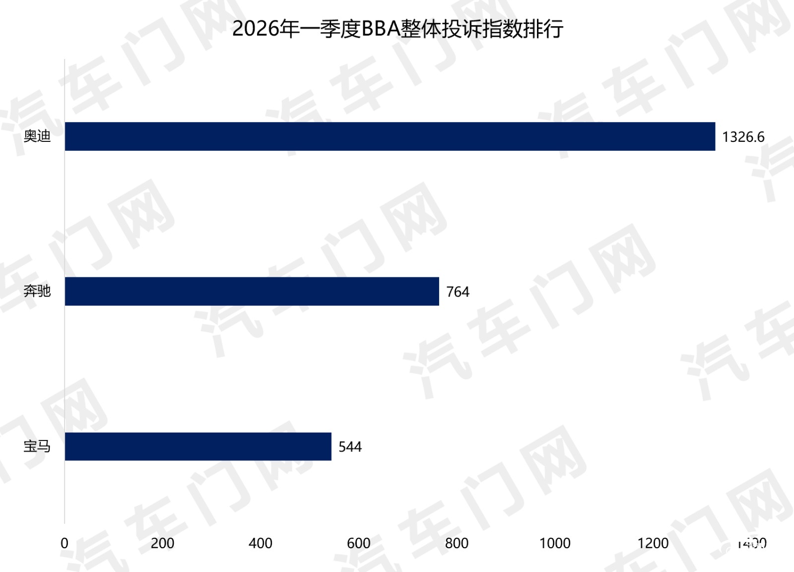 汽车门网投诉数据显示:今年一季度,奥迪的投诉指数达到了1326.6,同比增长了91%,在BBA三家传统豪华品牌中位列榜首。奔驰的投诉指数达到了764,同比上涨了109%。宝马则逆势下降15%,成为三者中唯一投诉下滑的品牌。