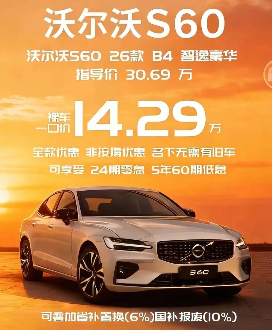 各位老铁,最近我一位在大学当老师的朋友,遇到了个典型的“中年选择题”。开了七八年的合资家轿,想换台车,提升点生活品质。他骨子里是个保守派,看重安全、环保和质感,对BBA的张扬不太感冒,一直觉得沃尔沃S60这种低调有内涵的车型是他的“菜”。可过去一看价格,中配落地怎么也得三十万往上,摸摸钱包,只能叹口气。直到上周末,他神神秘秘地打电话给我,声音里透着不敢相信:“老王,你快帮我看看!S60现在裸车价喊到14万29了?这……这价是不是有什么猫腻?都能买雅阁凯美瑞了,我还用纠结吗?”今天,咱们就好好算算这笔账,当一台沃尔沃S60的价格杀入普通合资B级车区间时,它到底是“真香馅饼”,还是“有毒陷阱”?