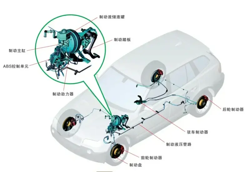 制动液:刹车液是制动系统的工作介质,通过刹车液管路传递压力,使刹车片与刹车盘接触。