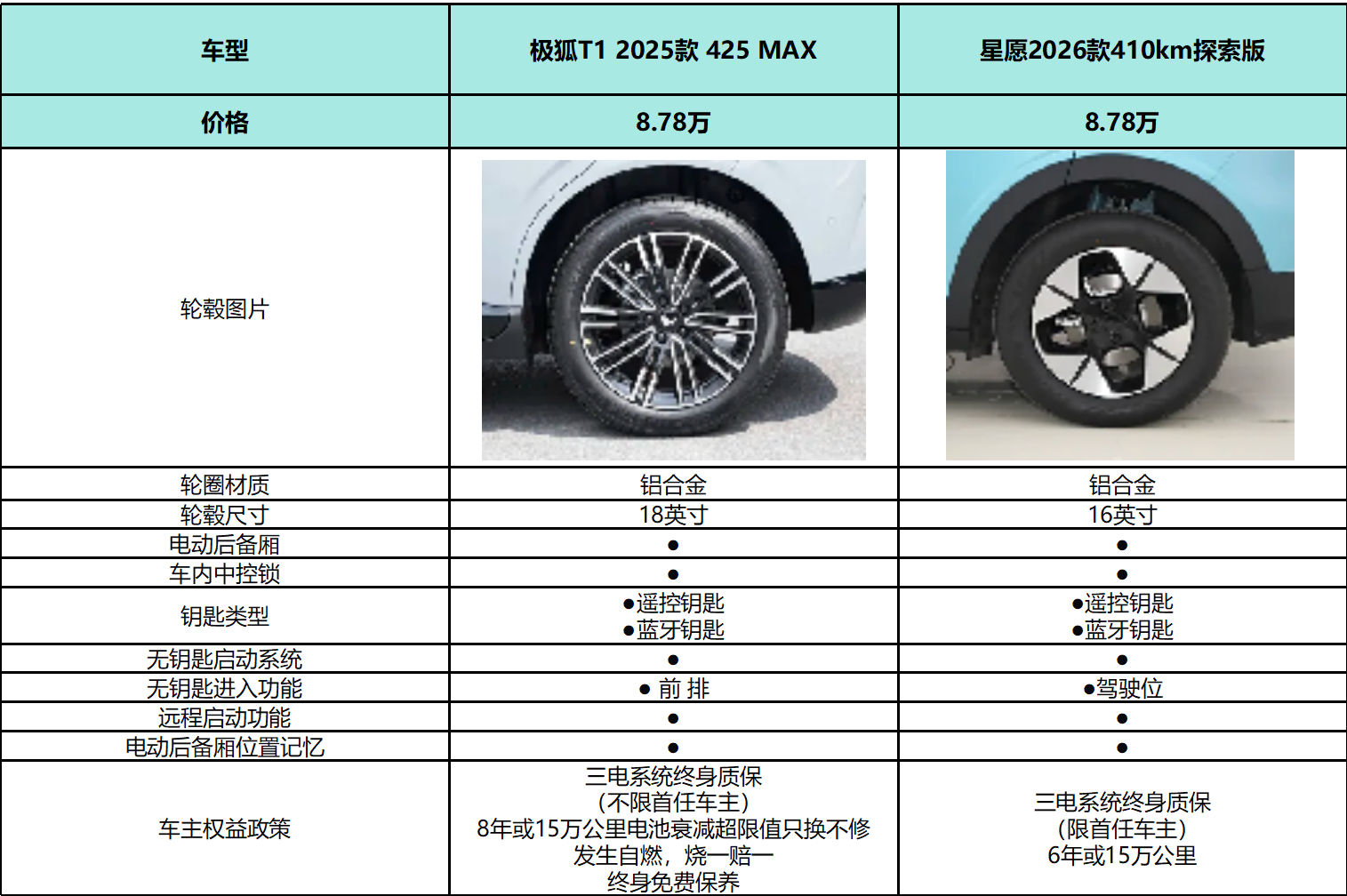 电池技术与质保政策是电动车价值的压舱石。极狐T1搭载的“极光电池”强调超高安全标准,宣称不仅提前一年通过了新国标17项系统测试和6项关键测试,甚至很多标准都超出了新国标的要求;更关键的是,同一块电池能连续通过“水下刮底、颠簸,挤压,火烧” 三项极端测试。在售后保障上,T1给出了“三电系统终身质保(不限首任车主)”、“8年或15万公里电池衰减超限值只换不修”以及“发生自燃,烧一赔一”的三重承诺,同时还提供了“终身免费保养”。星愿也提供了三电终身质保(限首任车主)。相比之下,T1的质保条款在终身属性上不设车主限制,且增加了“只换不修”和“烧一赔一”的强力承诺,并将保养成本也囊括进终身权益,试图彻底打消用户的后顾之忧,这波操作显得诚意很足。