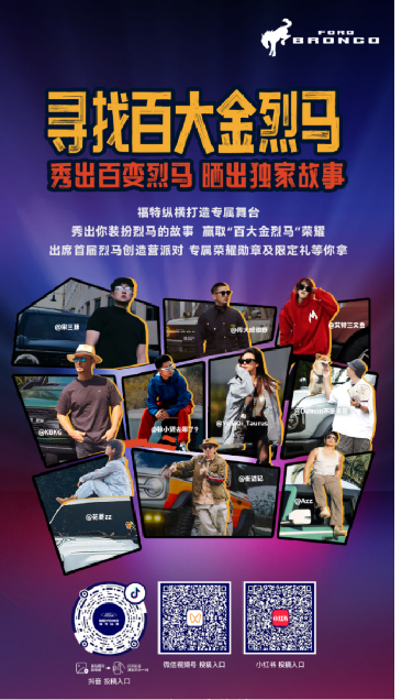 无论你是烈马的老司机,还是新入手的爱车人士,只要你在抖音、小红书或微信视频号上发布你的烈马改装经历或创意作品,就有机会参与海选,成为“百大金烈马”的一员。这场为期三个月的改装盛宴,将选拔出最具创意和个性的烈马,让它们在全球知名的福特纵横户外主题乐园中大放异彩。