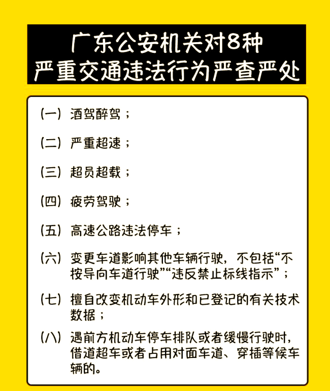 A:为了贯彻落实宽严相济、过罚相当的执法理念,我省针对酒驾醉驾、严重超速、超员超载、疲劳驾驶以及高速公路违法停车等严重扰乱交通秩序、极易引发交通事故的违法行为,制定了专门的“严重违法严查”清单。