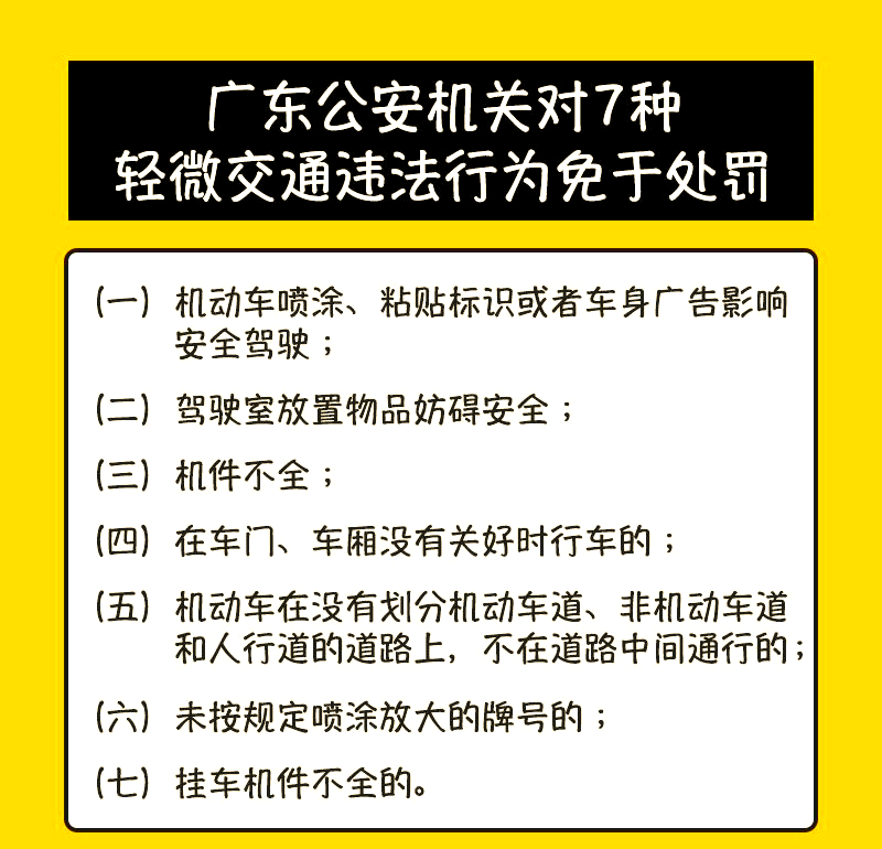 为深入推进“我为群众办实事”实践活动,并贯彻落实教育与处罚相融合的原则,广东公安机关自2021年7月1日起,对7类轻微的交通违法行为采取了免于处罚的措施,同时对10种一般交通违法行为在首次违法时给予警告处罚,而对于8种严重交通违法行为则坚持严查严处。