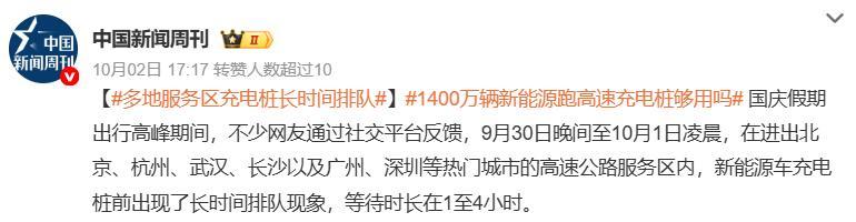 在今年国庆部分热门城市的服务区充电桩,甚至出现了1到4小时的长时间排队现象。