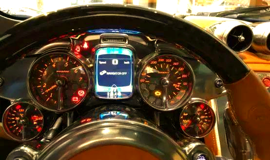 这款帕加尼的仪表盘设计得相当华丽,每几秒钟就能换一种炫彩,非常吸引人。尽管这款车并未特别针对中国市场进行汉化处理,但其仪表底部的速度仍以260英里为标准,彰显出其国际化的设计理念。