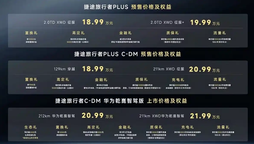 首先,二者区别在于动力形式不同,前者是燃油后者为插混,但共同点在于均提供七座布局。接着再看价格,其中捷途旅行者PLUS的预售价区间为18.99-19.99万,而捷途旅行者PLUS C-DM则是18.99-21.99万,相对而言还是能够凸显品牌诚意,更何况厂家也提供诸多权益可享受,像置换补贴、金融贴息以及终身质保等等,进一步降低购车成本的同时让后期用车也足够安心。