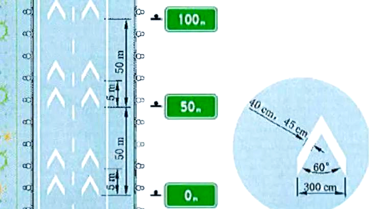 图示详解:纵向减速标线呈现为平行于车道分界线的菱形块状虚线,其设计旨在通过视觉上的压迫感,强烈提示驾驶员在该区域必须减速慢行,以确保行车安全。