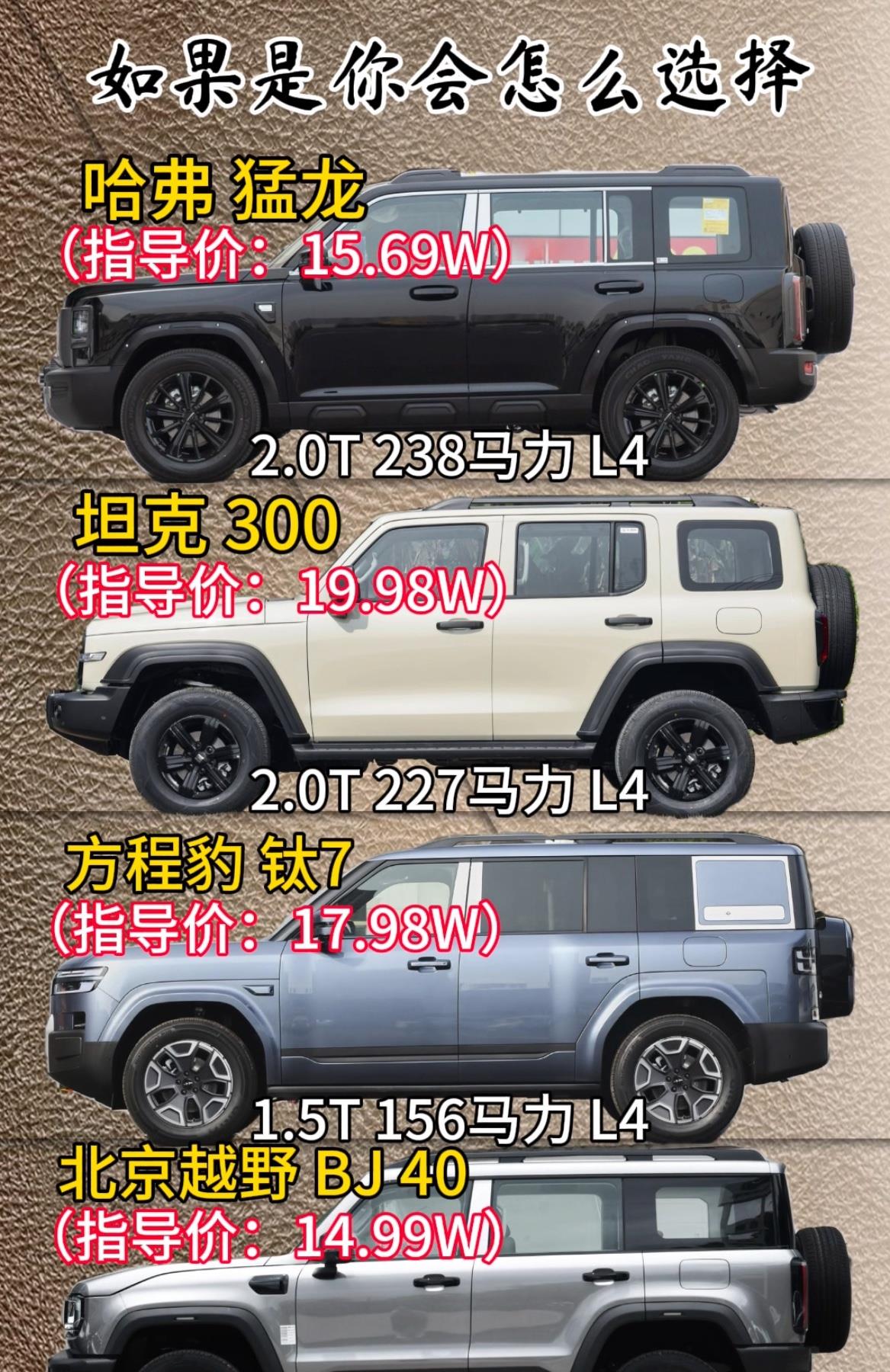 预算15到20万,硬派越野到底该怎么挑?我有个朋友上个月非要拉着我去看车,他说自己看了一圈,眼睛都花了。哈弗猛龙2.0T动力强,15.69万;坦克300口碑硬,19.98万;方程豹钛7科技感拉满,17.98万;北京BJ40看着最便宜,14.99万。他问我:“你说我该选哪个?”我当时没直接回答,回家翻了一堆数据,发现这事儿没那么简单——光看指导价,你可能买贵了不止两万。