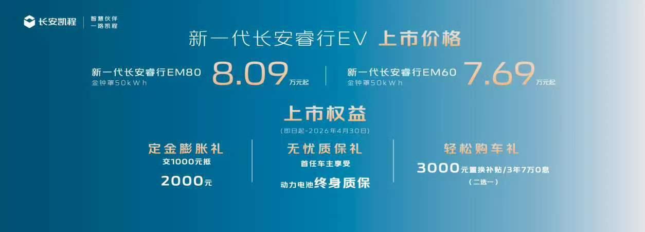 最后说到价格和政策。新一代长安睿行EM60版本7.69万元起,EM80版本8.09万元起。在2026年4月30日之前下订,还能享受三重专属福利:交1000元抵2000元的定金膨胀、首任车主动力电池终身质保,以及3000元置换补贴或3年7万0息贷款。这几乎就是冲着“先把门槛打穿”去的,它不是豪赌高毛利,而是押注更大的用户盘子。说得更直白一点,这不是一台想靠溢价证明高级的车,而是一台想靠效率证明自己值钱的车。