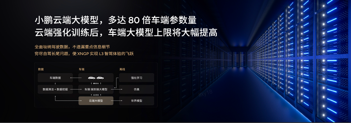 他说,云端大模型的参数量是车端模型的几十倍甚至数百倍,能吸纳更多的智驾数据,解决更多的长尾问题。这样一来,XNGP就能给咱们带来L3级的智驾体验了。而且,小鹏的云端大模型训练效率已经提升了2.6倍,到2025年,小鹏云端的算力还会飙升到10EFlops以上。