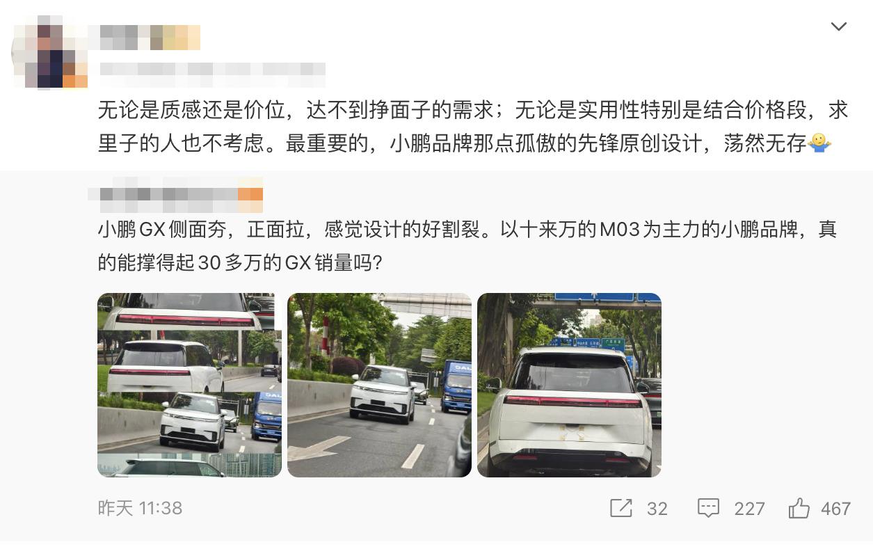 没想到汽车大V说话这么直接。知名车评人郑谊前两天发了个视频,直言不讳地怼了小鹏GX的设计问题,原话大概意思是:豪华车上很少见白色的,你见过几个白色的S级和奥迪A8?小鹏GX的白色确实不好看。而且侧面太像路虎揽胜了,原创度跟当年的P7没法比。