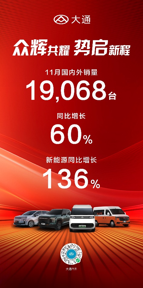 轻客持续领跑,货运创富有大通:轻客车系11月热销9,941辆,同比增长81%,巩固“中国轻客第一品牌”地位。新能源“创富神车”大通大拿热销3,207辆,同比劲增214%!成货运物流市场“创富标杆”。11月11日,上汽大通与上海市道路运输行业协会达成150台大拿V1战略订单,首批50台交付,成上海货运出租行业首批新能源车型;“大VAN市场破局者”大拿V1L,上市首月订单突破3000辆,成为行业黑马。