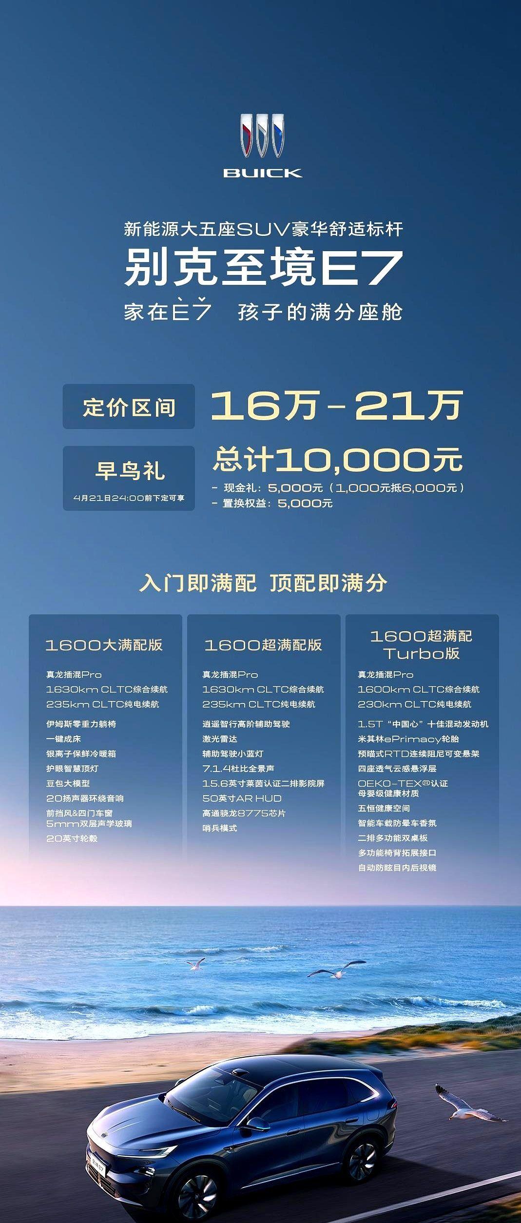 2026年的中国新能源市场,已经卷到连合资品牌都不敢再端着架子了。继日产用NX8把插混SUV的入门价拉到15万以内之后,别克也坐不住了。4月10日,别克高端新能源子品牌“至境”旗下首款SUV:至境E7正式公布三款车型配置,定价区间锁定在16万至21万元,将于4月22日正式上市并开启交付。