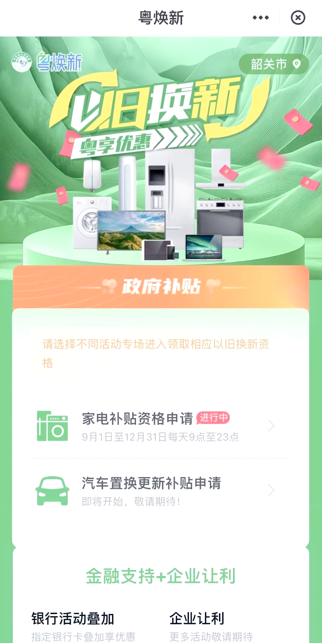 第一步:通过云闪付或微信搜索“粤焕新”小程序,并进入韶关市“以旧换新”的主页面。