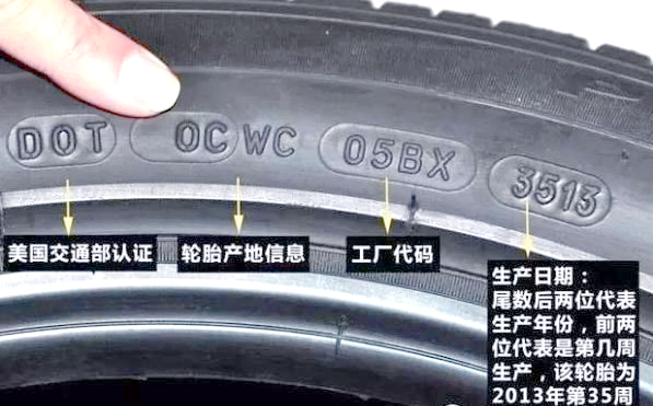再来看“3513”这一生产日期标识,其中后两位数字代表年份,而前两位则表示周数,合起来即意味着这款轮胎是在2013年的第35周生产的。
