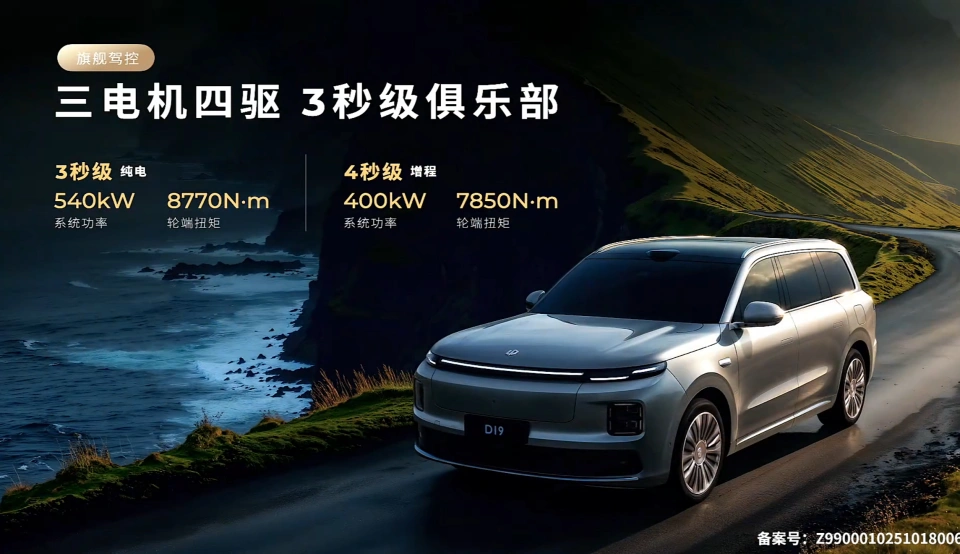 最让我感兴趣的是它的动力系统。增程版居然能做到纯电续航500公里,综合续航超过2000公里,这数据确实惊艳。三电机四驱版本的系统功率达到400千瓦,零百加速只要4秒级,对于这么大一台车来说,性能相当强悍了。纯电版的性能更是夸张,540千瓦的系统功率,零百加速直接进入3秒俱乐部,续航也能达到720公里。