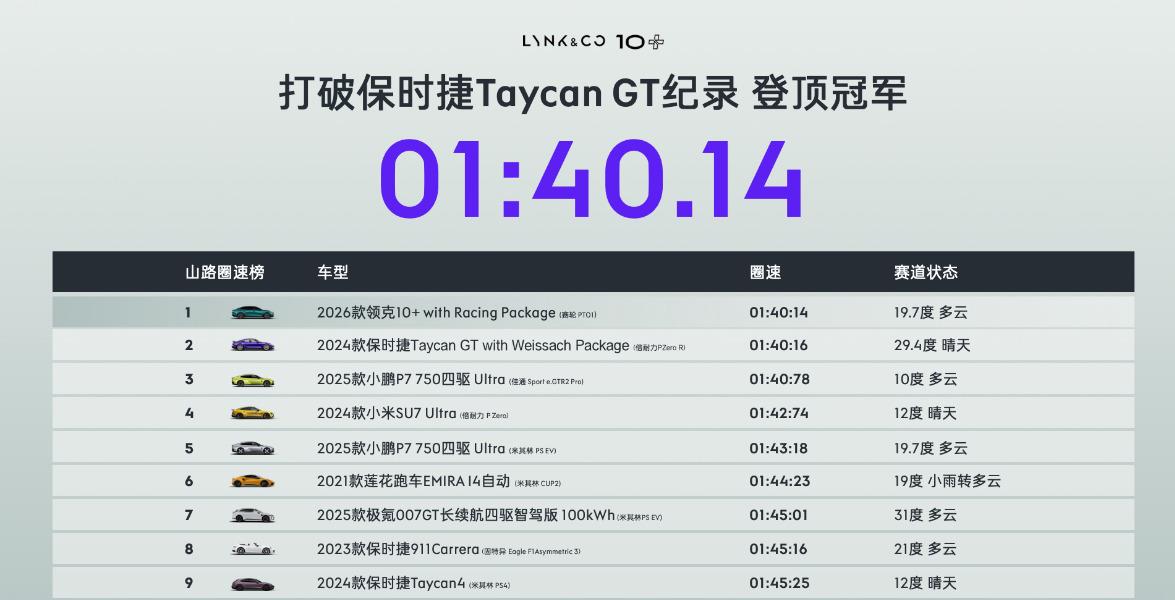 但最让性能车玩家兴奋的不是直线加速,而是弯道表现。领克10+配备了官方的Racing Package性能套件,在亚洲山脊赛道进行了实测,圈速成绩为1分40秒14。这个成绩直接超越了保时捷Taycan GT,让领克10+加冕了“弯道之王”的称号。现场有赛车手试驾后表示,这车的底盘调校和电控系统配合得极其精准,过弯时的稳定性和响应速度完全不像一辆中大型轿车,更像是一辆专业的赛道机器。