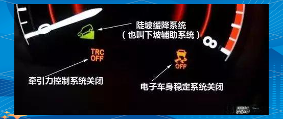 除了电子安全系统标识外,四驱系统的标识也逐渐受到消费者的关注。随着SUV车型的普及,越来越多的人喜欢在野外活动,因此购买配备四驱系统的SUV已成为新趋势。若您的座驾是四驱SUV,那么仪表盘上可能会展示出如下标识:陡坡缓降、四驱模式启动、四驱模式锁定以及四驱系统差速锁锁止等。这些图标的亮起,都意味着四驱系统正在发挥其作用。