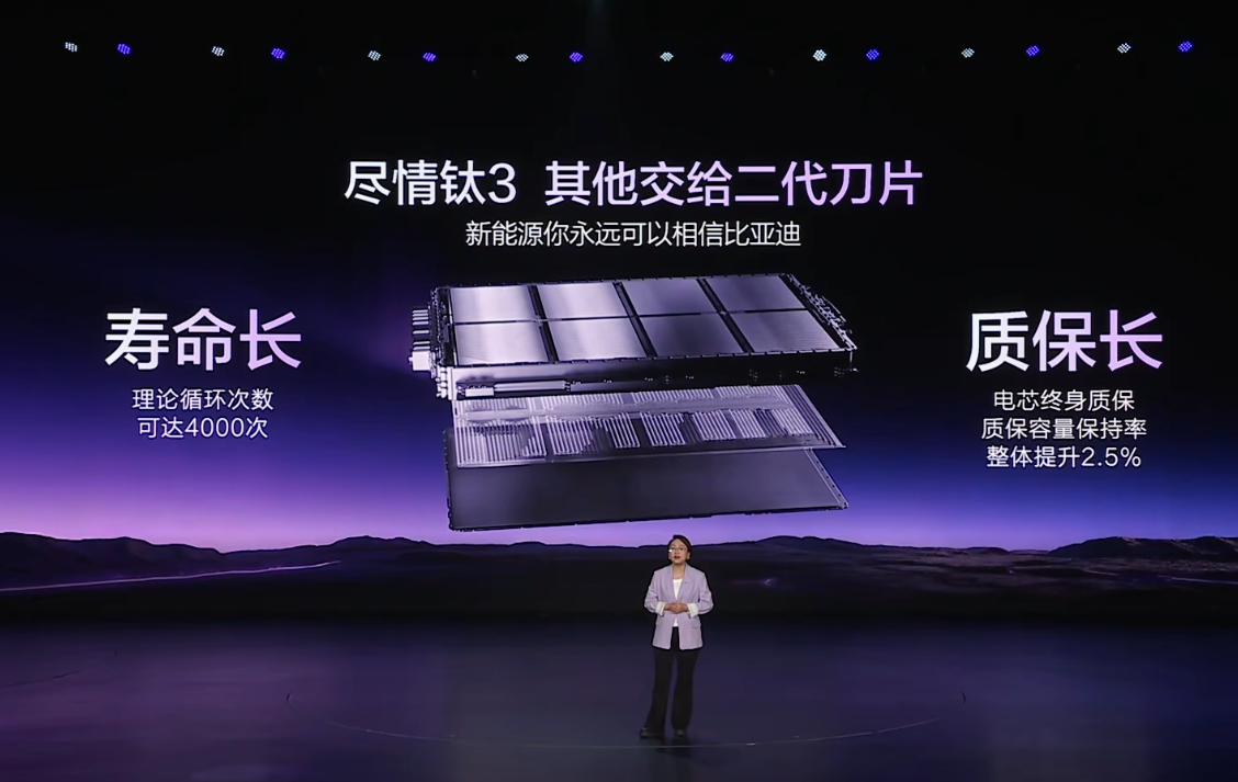 电池是第二代刀片电池,通过了10倍国标底部撞击和4倍热扩散试验,还做了所谓的边闪充边针刺测试,500次循环后无明火无爆炸。