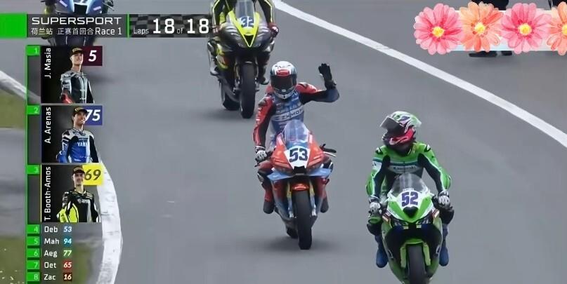 再说回4月18日刚结束的荷兰站。就在昨天,张雪机车在阿森赛道的排位赛里又搞了个大新闻。超级杆位排位赛40分钟角逐,瓦伦丁·德比斯跑出了1分36秒561的单圈成绩,拿下第二名,你知道和第一名的差距是多少吗?0.071秒。就差了不到0.1秒。这还是在阿森这条出了名难跑的经典高速赛道上,加上赛道湿滑、车队零测试数据的条件下跑出来的。排位赛成绩直接决定正赛发车位置,从第二位发车,正赛冲击冠军的概率就大了去了。