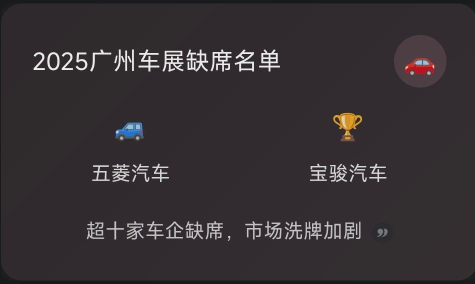 2025 年广州国际车展的喧嚣中,五菱汽车与宝骏的双双缺席,成为最刺眼的沉默。这绝非 “无新车可发”